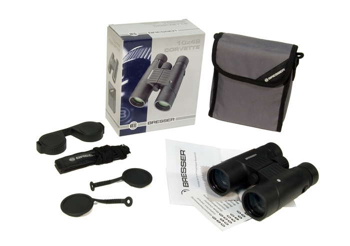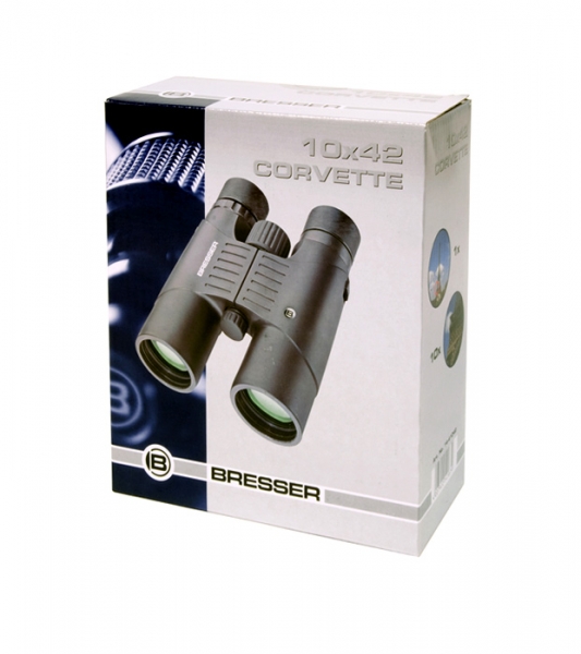 Bresser Corvette 10x42 – больше, чем обычный бинокль. Помимо всех основных характеристик, которыми обладают бинокли марки Bresser, данная модель отличается повышенной влагостойкостью и сверхпрочным корпусом. Такой бинокль крайне сложно разбить или даже поцарапать. Его можно использовать и в проливной дождь, и под шквалом морских волн – вода будет просто стекать по обрезиненному корпусу, не попадая внутрь. А так как внутри он заполнен инертным газом, то Вы никогда не узнаете, что такое конденсат на линзах. Можно сказать, что это бинокль для «настоящих мужчин», привычных к соленым брызгам моря, горным походам и опасным сплавам по рекам. Зеленый оттенок всех элементов оптики говорит о максимальном увеличении светопропускания линз. Это дает возможность использовать бинокль в самых разных условиях. Яркое неразмытое изображение без аберраций – результат использования стекла BaK-4 для изготовления линз. Благодаря широкому полю зрения, Вы сможете не просто наблюдать за определенным объектом, но и видеть окружающее его пространство в высоком качестве – например, оленя на лесной опушке или птицу в небе. Межокулярное расстояние легко регулируется сдвиганием центральной части соединения труб. Резиновое покрытие корпуса и окулярных наглазников помогает придать корпусу бинокля особую прочность и влагостойкость. Если Вы носите очки, то и они не станут помехой в наблюдениях, поскольку наглазники выдвигаются, а окуляры снабжены диоптрийной коррекцией.