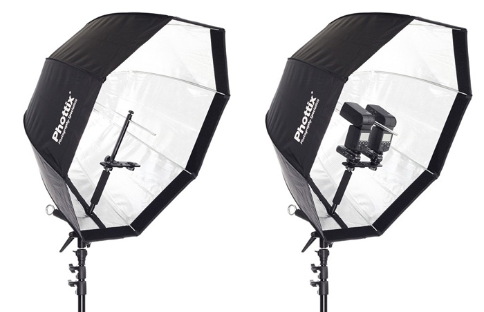• Позволяет установить одну или несколько вспышек направленных в центр зонта, либо зонта-софтбокса Phottix Easy-Up, а также подобных софтбоксов других производителей для более равномерного распределения света.