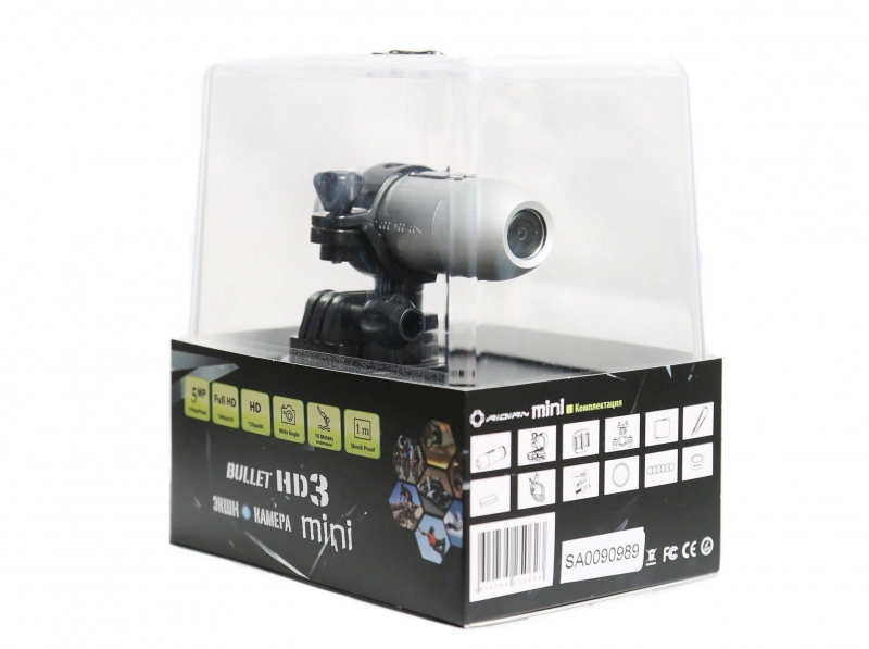 На смену предыдущей модели популярных экшн-камер Bullet HD Lite 2, в свет вышла новая камера уже ТРЕТЬЕГО поколения семейства Bullet HD! Представляем вам новую экшн-камеру – BulletHD 3 Mini – самая компактная и лёгкая камера из серии BulletHD, она идеально подходит для установки на амуницию спортсмена. При миниатюрных габаритах и весе меньше 100 грамм эта ударопрочная, пылестойкая и водонепроницаемая камера снимает видео в разрешении Full HD, а также HD на скорости 60 кадров в секунду! В камере BulletHD 3 Mini используется технология FishEye, что позволяет снимать видео c углом обзора 140°. Камера чрезвычайно проста в управлении: всего одна кнопка! Для удобства при установке вне зоны видимости к световым индикаторам добавлена вибро-индикация: разные вибросигналы помогут вам понять, в каком режиме работает камера, даже если вы её не видите! Помимо этого, BulletHD 3 Mini совместима с пультом ДУ для удобного управления камерой при установке вне зоны досягаемости. К камере прилагаются оба вида заглушек панели управления: колпачок с отверстием для записи звука и колпачок для водных видов спорта, позволяющий проводить подводную съёмку на глубине до 10 метров без дополнительных громоздких боксов!
