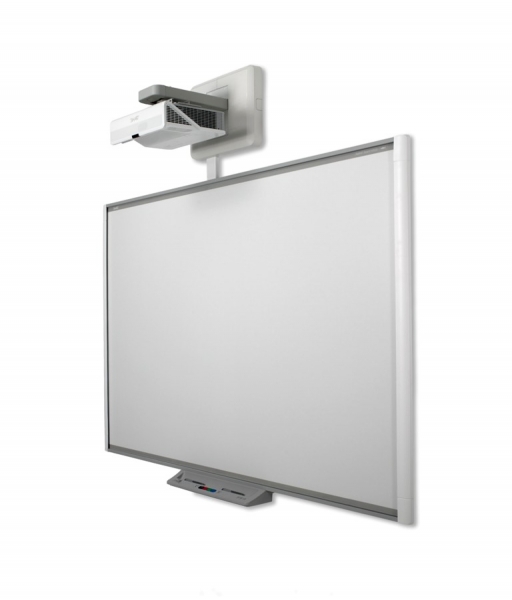 Smart Board SBM680iv5 – интерактивная система, позволяющая проводить качественные презентации, уроки, семинары и конференции. Конструкция включает в себя интерактивную доску на базе DviT технологии и ультракороткофокусный DLP проектор. Доска различает до 6 одновременных касаний. Взаимодействовать с поверхностью можно как пальцем, так и любым тупым предметом. Поверхность доски приспособлена также для записей, оставленных обычным маркером сухого стирания – она устойчива к повреждениям и легко очищается сухой губкой.