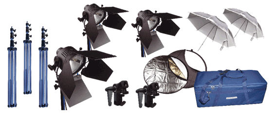 Профессиональное решение для постановки света из 3-х точек. Три универсальных светильника рассеяно-направленного светаи Logocam D-Spot 1000 в качестве как заливающего, так и рисующего или контрового света. Наличие диммеров, 2-х отражающих зонтов и набора рефлекторов дает возможность тонкой настройки освещения. Состав комплекта: