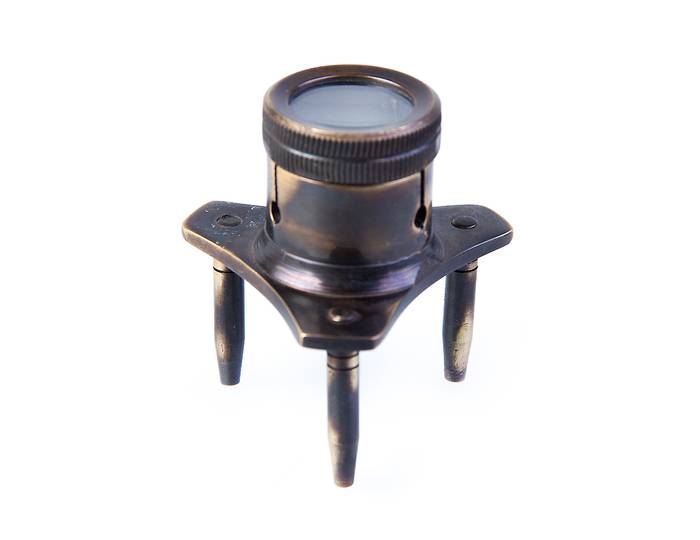 Копия английской настольной лупы конца XVII века. Ручная работа, выполненная индийскими мастерами. Материал корпуса и ножек — патинированная (состаренная) бронза. Чтение с этой лупой старинных манускриптов и рукописей помогает проникнуть в сакральный смысл пророчеств и предсказаний. Технические характеристики Увеличение, крат: 6 Диаметр линзы, мм: 21 Длина ножек, мм: 29 Материал линзы: стекло Материал корпуса: бронза Габаритные размеры, мм: 62x56 Вес, г: 92 |