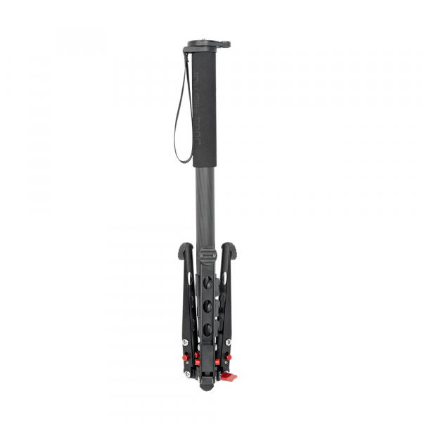 Четыре секции из карбона с клипсовыми зажимами из ABS пластика. Диаметр секций — 32, 28, 25, 22 мм. При ослаблении клипсового фиксатора — возможна регулировка зажима винтом под шестигранный ключ. На верхней секции предусмотрены: накладка-рукав из вспененного материала для комфортного удержания монопода в холодное время года и кистевой ремень для удобства удержания монопода рукой. Круглая площадка верхней базы монопода имеет реверсивный винт 1/4" - 3/8", на который крепится видеоголовка, а при необходимости непосредственно камера. Пузырьковый уровень находится на круглой площадке и имеет возможность вращаться вокруг монопода.