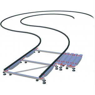 Операторская модульная рельсовая система UNI TRACK System. Предназначена для перемещения по ней различных видео приспособлений (операторские тележки, студийные пьедесталы и т.д.) весом до 200 кг. UNI TRACK System - представляет собой устойчивую и гибкую конструкцию, при помощи которой возможно выстроить практически любую траекторию движения камеры: от прямолинейной - до кривой с радиусом 1,5 м. На металлические направляющие в качестве рельсового полотна укладывается круглый полнотелый резиновый профиль диаметром 35 мм, что обеспечивает плавность и мягкость хода. Направляющие рельсовой системы выполнены из прочного, легкого алюминиевого сплава в виде прямолинейных участков длиной 0,5 м, соединенных между собой шарнирами. Каждый шарнир системы UniTrack имеет поддерживающий блок, который позволяет выравнивать уровень рельс через каждые 0,5 м. Диапазон регулировки по высоте каждого такого узла составляет 5 см. Для обеспечения постоянной ширины колеи рельсового полотна используются регулировочные планки, которые соединяются с левым и правым суппортом, поддерживая постоянную ширину рельсовой системы.