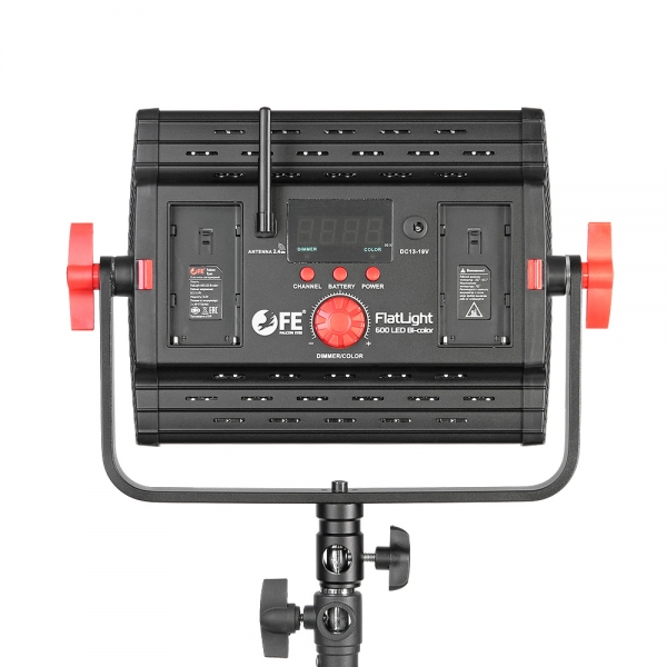 На задней панели прибора находится большой ЖК экран с 4-разрядной индикацией, удобный диммер (выполняющий функцию изменения яркости и цветовой температуры), кнопки управления режимами работы, кнопка выбора источника питания, вход и выход DMX (обеспечивают внешнее управление через консоль, приобретаемую отдельно).
