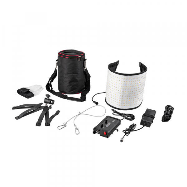 Гибкая и ударопрочная панель осветителя FreeLight 504 bi-color позволяет использовать прибор в самых неблагоприятных условиях вне студии. Мощности 504 современных сверхярких SMD светодиодов (CRI более 96) будет достаточно для решения большинства задач съемки. На обратной стороне панели находится кабель (длинной около 60 см) для подключения к модулю управления и «липучка» для крепления светорассеивателя. По углам панели расположены пластиковые ушки для крепления на держателе для установки на стойку. Держатель представляет собой четыре стальных лапки на шаровом шарнире с винтовой фиксацией. Установка держателя на стойку возможна как вертикальном так и в горизонтальном положении. Для этого в основании держателя есть два перпендикулярных отверстия. Внутренний диаметр отверстий под стойку составляет 16 мм. Фиксация держателя на стойке — винтовая. Для получения мягкого светового потока в комплекте предусмотрен светорассеиватель из синтетического полупрозрачного материала. Крепление рассеивателя производится за счёт «липучки» велкро на обратной стороне панели. По периметру рассеивателя находится светоотражающие «серебряное» покрытие.