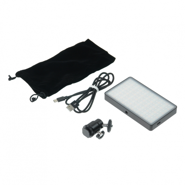 Емкость встроенного аккумулятора рассчитана на автономную работу осветителя до 2 часов на полной мощности и до 10 часов при средней нагрузке. В комплект входит кабель USB–mini-USB для зарядки встроенного аккумулятора стандартным зарядным устройством 5В 3000мА. Надежный алюминиевый корпус, с тыльной стороны которого расположены кнопки управления и контрастный цветной цифровой дисплей. Осветитель крепится к шаровой мини-головке с винтом ¼", входящей в комплект, и устанавливается в разъем типа «башмак». В комплект входит мягкий чехол для безопасного хранения и транспортировки устройства.