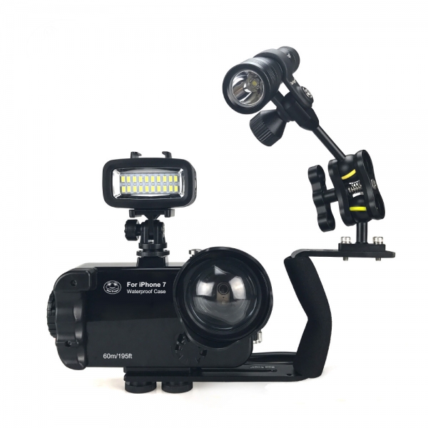 Три штативных гнезда снизу бокса, а также крепление типа "холодный" башмак, позволяет крепить рукоятки и армов для подводных фонарей.