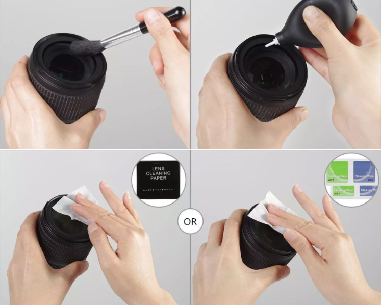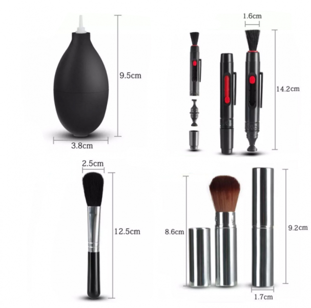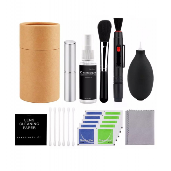 Профессиональный набор для чистки оптики 10 в 1: 2 кисточки, ватные палочки, груша, влажные салфетки, сухие салфетки, тканевая салфетка, карандаш, флакон для чистящей жидкости (жидкость в комплект не входит), тубус для хранения. |