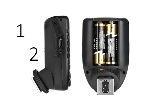 Большой ЖК дисплей, 5 кнопок групп и 4 функциональных кнопки обеспечивают удобство манипуляций. Кнопки групп (1), Функциональные кнопки (2) Обновление прошивки через USB разъем типа С. Беспроводная синхронизация через гнездо для синхрокабеля 2,5мм. USB разъем тип C (1), Гнездо для синхрокабеля 2,5мм (2) *2 батарейки АА Большая портативность Xpro-O – его вес всего 80 г.