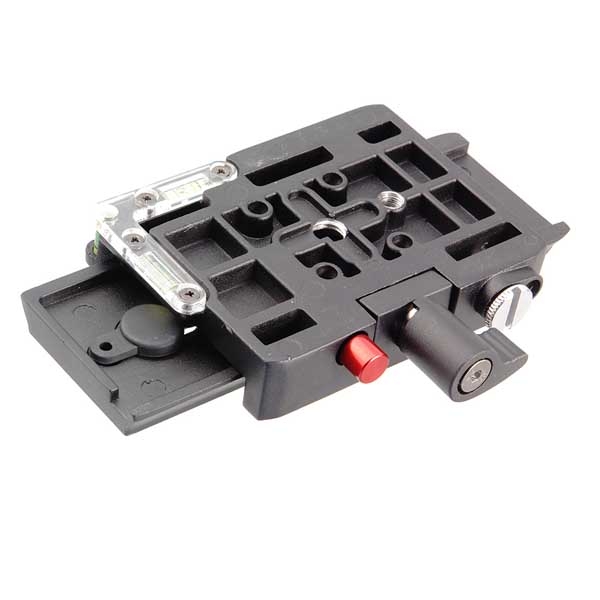 Предназначен для создания посадочного места типа «быстросъемная площадка» на риге, слайдере, обычной штативной голове, носимых стабилизаторах камер, кронштейнах (типа GB-DV02) и etс. Имеет два пузырьковых уровня для выставления камеры в горизонт. Адаптер состоит из базы и подвижной площадки. База имеет пять резьбовых отверстий 1/4 дюйма и одно отверстие 3/8 дюйма — для крепления к несущей опоре. На подвижной площадке имеется паз длиной 75 мм для перемещения винта камеры (винт 1/4 дюйма, сменный, 3/8 дюйма в комплекте, заменяется после снятия резиновой заглушки в конце паза). В «отпущенном» положении площадка может передвигаться по базе в пределах 55 мм, нужное положение фиксируется удобным зажимным винтом. Красная кнопка это предохранитель — от случайного падения камеры с площадкой при отпущенном зажимном винте.