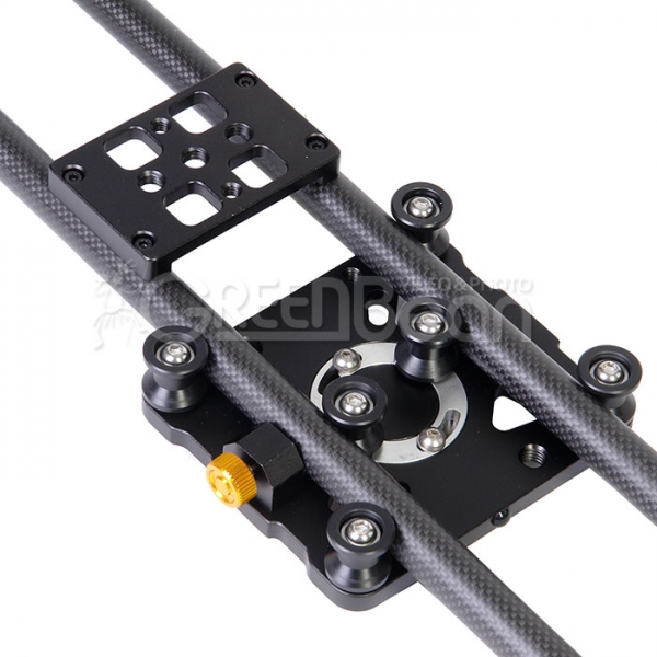 На каретке находится винт диаметром 1/4" (в комплекте переходник 3/8") и отверстия с резьбой диаметром 1/4" и 3/8" для установки вспомогательного оборудования. Сверху на каретке расположен пузырьковый уровень, который поможет выставить слайдер по горизонту. Винтовой фиксатор позволит зафиксировать каретку в определенном положении, а резиновые упоры на торцах каретки предотвратят жесткие удары в крайних положениях.