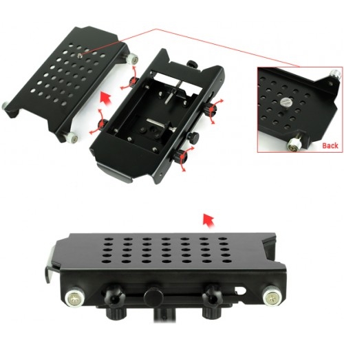 • Быстросъемная площадка: Конструкция быстросъемной площадки позволяет легко и быстро установить/демонтировать камеру, при этом, не сбив настроек остального оборудования. Площадка оснащена отверстиями для стандартных винтов 1/4" и 3/8", что делает ее совместимой с широким рядом моделей современных видеокамер. Положение площадки можно регулировать как по вертикали, так и по горизонтали. Площадка обеспечивает прочную и надежную фиксацию камеры, предотвращая появление малейшей тряски или вибрации в кадре.