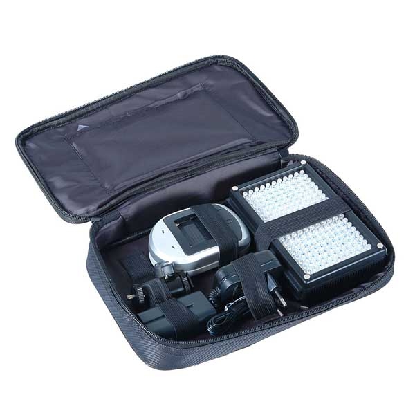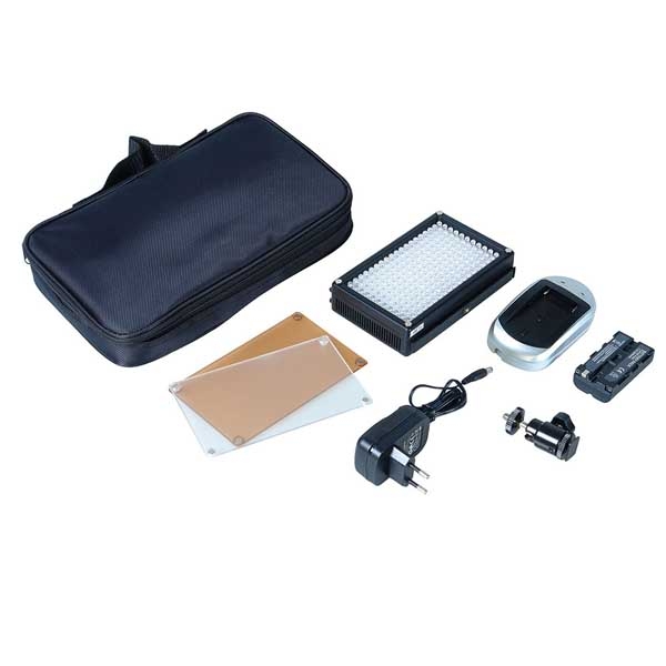 Постоянная яркость сохраняется даже при низком заряде аккумулятора. Цифровой контроллер работающий по методу широтно-импульсной модуляции (многоступенчатое диммирование без мерцания в выбранном положении) позволяет регулировать яркость прибора от 10 до 100%. В комплект входит: аккумулятор емкостью 2200 мАч, зарядное устройство, сетевой адаптер питания, кронштейн с шаровой головкой и посадочными разъемами «башмак» и 1/4", фильтр понижающий цветовую температуру (3200К), матовый рассеивающий фильтр, удобная сумка-чехол с ручкой и жесткими стенками. Емкости аккумулятора хватит примерно на 130 минут автономной работы, на панели управления находится кнопка индикации заряда батареи. Осветитель может работать от сетевого или автомобильного адаптера питания из комплекта.