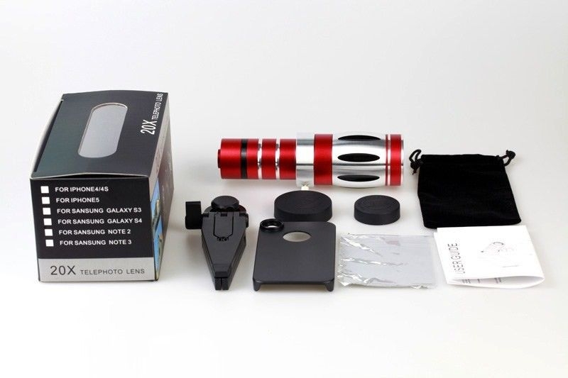 Телеобъектив для iPhone и Samsung - позволяет получить фотографии с 20-кратным увеличением. Угол обзора: 20 градусов Диаметр объектива - 21 мм Размер: 33х75 мм Вес: 271 г