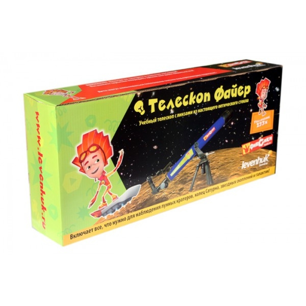 Телескоп Levenhuk Фиксики Файер будет интересен как совсем юным любителям астрономии, так и их родителям. Прибор прост в обращении, поэтому освоить его функции будет легко даже ребенку. С помощью телескопа можно вести интереснейшие наземные наблюдения, а также изучать разнообразные астрономические объекты, такие, например, как кратеры на Луне, облачные полосы на Юпитере или кольца Сатурна. В комплект входит окуляр 20 мм для наземных и астрономических наблюдений, а также более мощный окуляр 6 мм. Последний обеспечивает большее увеличение и используется для ночных наблюдений при спокойной атмосфере. Телескоп Levenhuk Фиксики Файер оснащен искателем с красной точкой. Красный светодиод создает проекцию на объект наблюдения, благодаря чему процесс наведения телескопа становится более быстрым и простым. Помимо самого телескопа, в комплект входят компас для правильного ориентирования во время астрономических наблюдений, ростомер и набор из трех постеров Levenhuk Фиксики, посвященных космической тематике. Плакаты отпечатаны на плотной мелованной бумаге формата А1 (84х60 см) и будут прекрасно смотреться на стене детской комнаты. Кроме того, они очень информативны, так что их изучение будет интересно не только ребенку, но и взрослым.