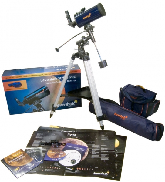 Уникальная сверхширокая дополнительная комплектация телескопов Strike PRO. Такого вы еще не видели! Данная серия телескопов включает в себя не только стандартные аксессуары серий Strike (печатные материалы, набор сменных окуляров, компас, программу-планетарий), но и дополнительные аксессуары, которые помогут использовать телескоп на полную мощность: окуляр Plössl 6,3 мм, 2х-кратую линзу Барлоу, набор цветных фильтров, солнечный и лунный фильтры, а также фирменную сумку для переноски телескопа Levenhuk Zongo 60. Сам телескоп Levenhuk Strike PRO упакован в картонную коробку привлекательной яркой расцветки.