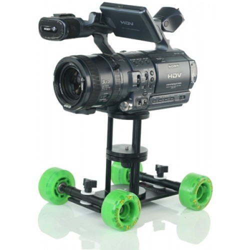 Еще одним преимуществом тележки является возможность увеличения размера площадки для камеры. Это позволяет устанавливать на нее дополнительное оборудование при необходимости. Тележку можно установить как на ровную, так и неровную поверхность, это абсолютно не влияет на качество результата. Тележка совместима с видеокамерами небольшого размера и с DLSR камерами.