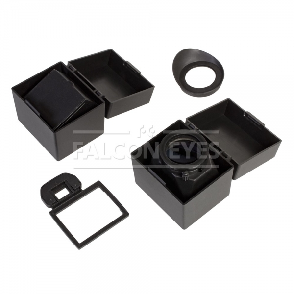 Первая насадка представляет собой видоискатель с 3х кратной линзой и резиновым наглазником, блокирует нежелательные блики от внешнего освещения и увеличивает изображение, данная насадка часто используется в системах стабилизации на основе рига. На окуляре насадки находится кольцо диоптрийной коррекции, это поможет настроить изображение под индивидуальные особенности зрения. Второй насадкой является угловой видоискатель ЖК монитора. С помощью системы зеркал позволяет повернуть изображение под углом 90˚ и увидеть отражение ЖК-монитора непосредственно над камерой. Это удобно при макросъемке, съемке с крайних нижних точек (когда трудно получить доступ к экрану низко расположенного фотоаппарата) и съемке событий происходящих сверху - птицы в полете, самолеты, парашютисты и т.д. В комплекте два пластиковых футляра для хранения комплекта.